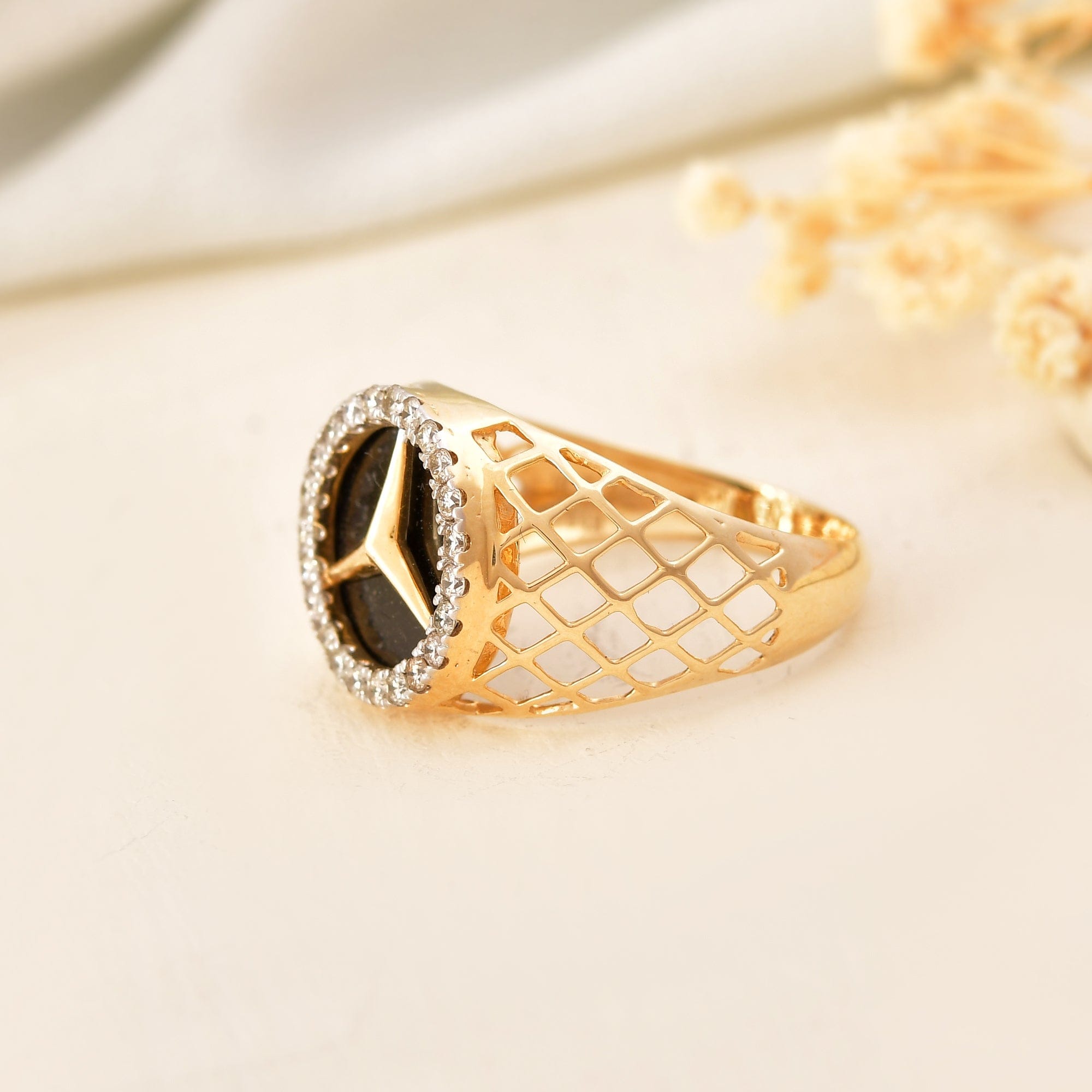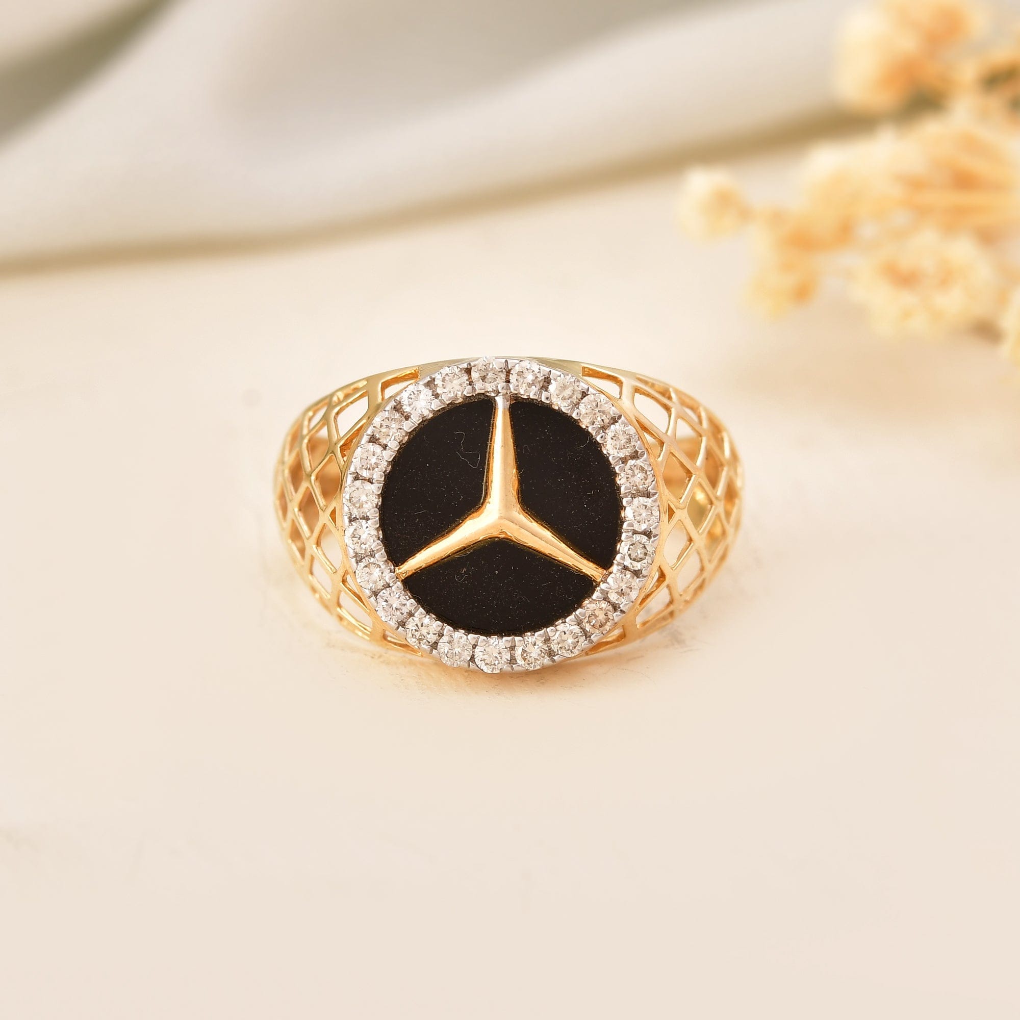 Mercedes Logo Men's Diamond Ring Black Stone Gold Band
